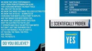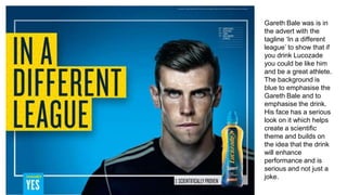The Lucozade Sport advertising campaign from 2013 featured athletes Gareth Bale and Alex Oxlade-Chamberlain to emphasize the drink's benefits for enhancing sports performance. The ads used a serious tone and scientific backdrop to suggest that Lucozade Sport provides better hydration and fueling than water. While the campaign was initially banned for failing to demonstrate benefits during prolonged exercise, it aimed to position Lucozade as the ideal drink for serious athletes.