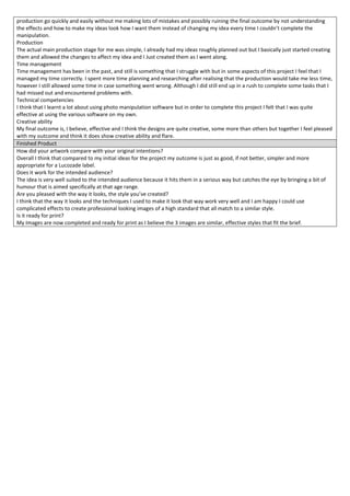 The document is an evaluation of a design project by the author. It begins by establishing that the finished product met the aims of the brief by capturing the target audience's eye and resonating with them. The author then evaluates their process, noting they used the correct software methods and techniques. While some images required more effort, overall the author demonstrated skill in using new software. Areas for improvement include putting more equal effort into each design. Research and feedback from others informed their ideas. Time management was an ongoing challenge but planning and preparation benefited the production. The finished products compare well to the original intentions, are suited to the intended audience, and the author is pleased with the style and professional quality achieved.
