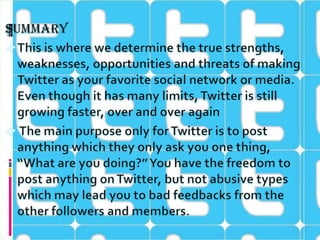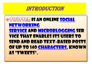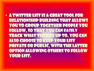 Twitter is an online social networking service that allows users to send and read text-based posts of up to 140 characters called "tweets". It was created in 2006 by Jack Dorsey and gained worldwide popularity with over 140 million active users by 2012. The document discusses how Twitter lists allow users to organize followers into groups, and provides examples of how lists can be used for media monitoring, market research, networking, and tracking competitors. It also outlines some advantages and disadvantages of using Twitter.