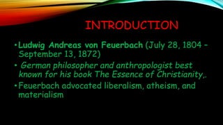 Ludwig Feuerbach was a 19th century German philosopher known for his book The Essence of Christianity. He received his education at the universities of Heidelberg and Erlangen, where he studied theology but became associated with the Young Hegelians. His most influential work was The Essence of Christianity, in which he argued that God is a human projection of our own nature, and that religion will be superseded as humanity progresses. Feuerbach advocated for atheism, materialism, and liberalism and believed religion poisoned the sense of truth.
