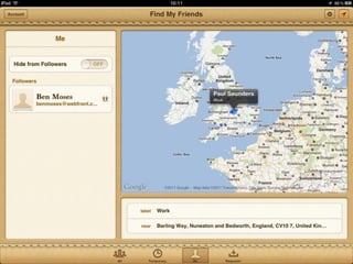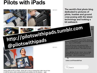 This document discusses the potential for tablets in the aviation industry. It begins by outlining how tablets could be used for technical publications, data acquisition, utilities, charts and navigation, and eLearning. It then addresses barriers to tablet adoption such as a lack of revenue potential and difficulty changing platforms. It provides options for deploying apps through an app store or custom solutions. It concludes by envisioning further tablet uses and capabilities in the future, such as ruggedized devices, peripheral integration, and near field communication sensors.