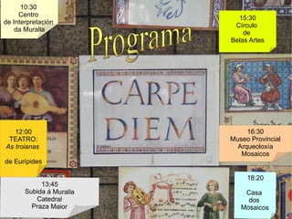 Programa 10:30 Centro de Interpretación da Muralla 12:00 TEATRO: As troianas de Eurípides 13:45 Subida á Muralla Catedral Praza Maior 15:30 Círculo de Belas Artes 16:30 Museo Provincial Arqueoloxía Mosaicos 18:20 Casa dos Mosaicos