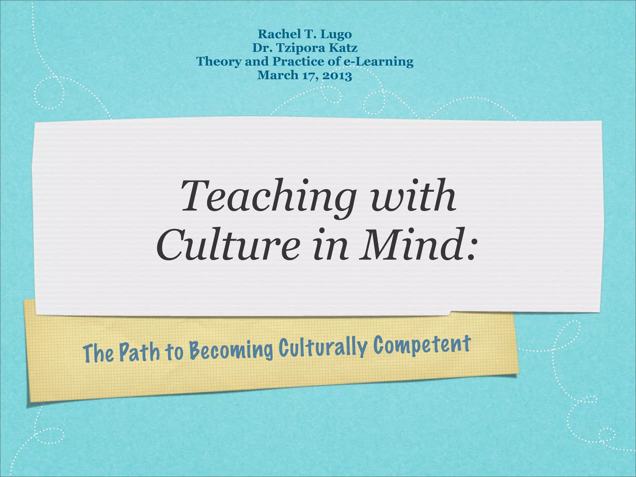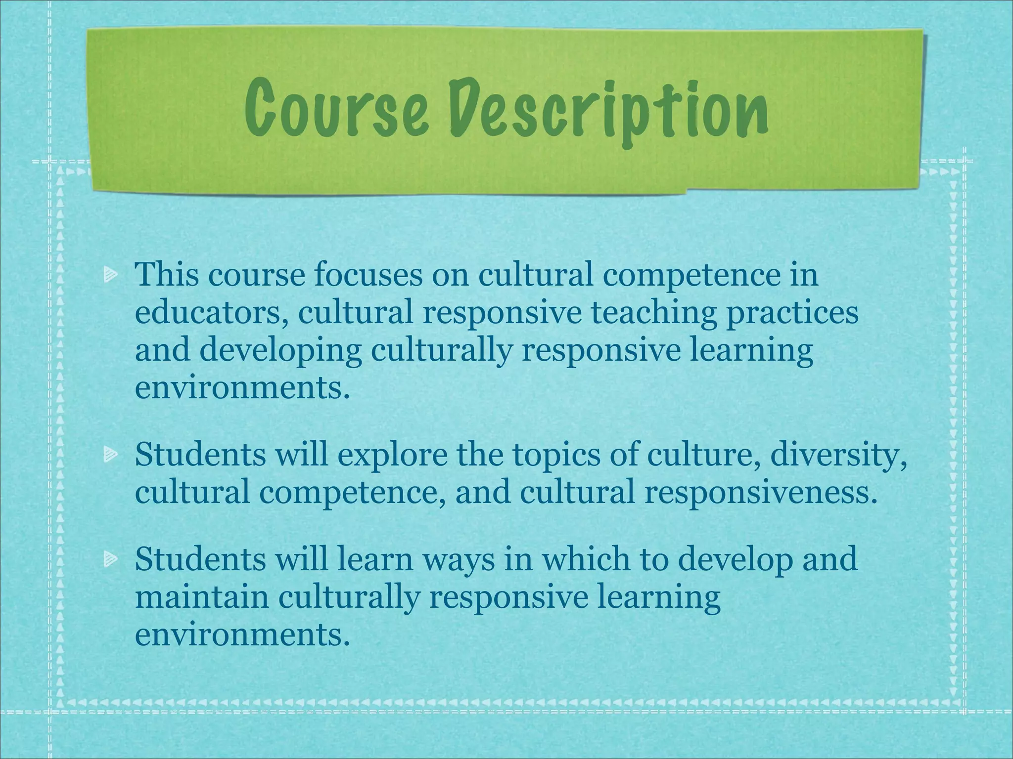 This 3-credit course focuses on developing cultural competence and responsiveness in educators. Students will explore culture, diversity, and ways to create culturally responsive learning environments. The constructivist approach is used, with students relating concepts to experiences and engaging in discourse. Readings, videos, scenarios, and discussions are learning methods. Objectives are defining culture and diversity, assessing cultural awareness, and identifying responsive teaching practices. Outcomes include acknowledging diversity as an asset and implementing inclusive practices. The online platform is accessible. Weekly topics cover self-awareness, practices, and implementing strategies. A reflection addresses cultural awareness as a foundation for teachers.