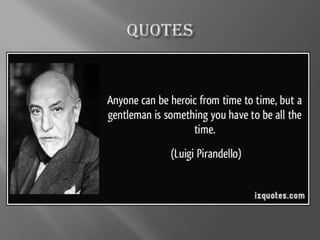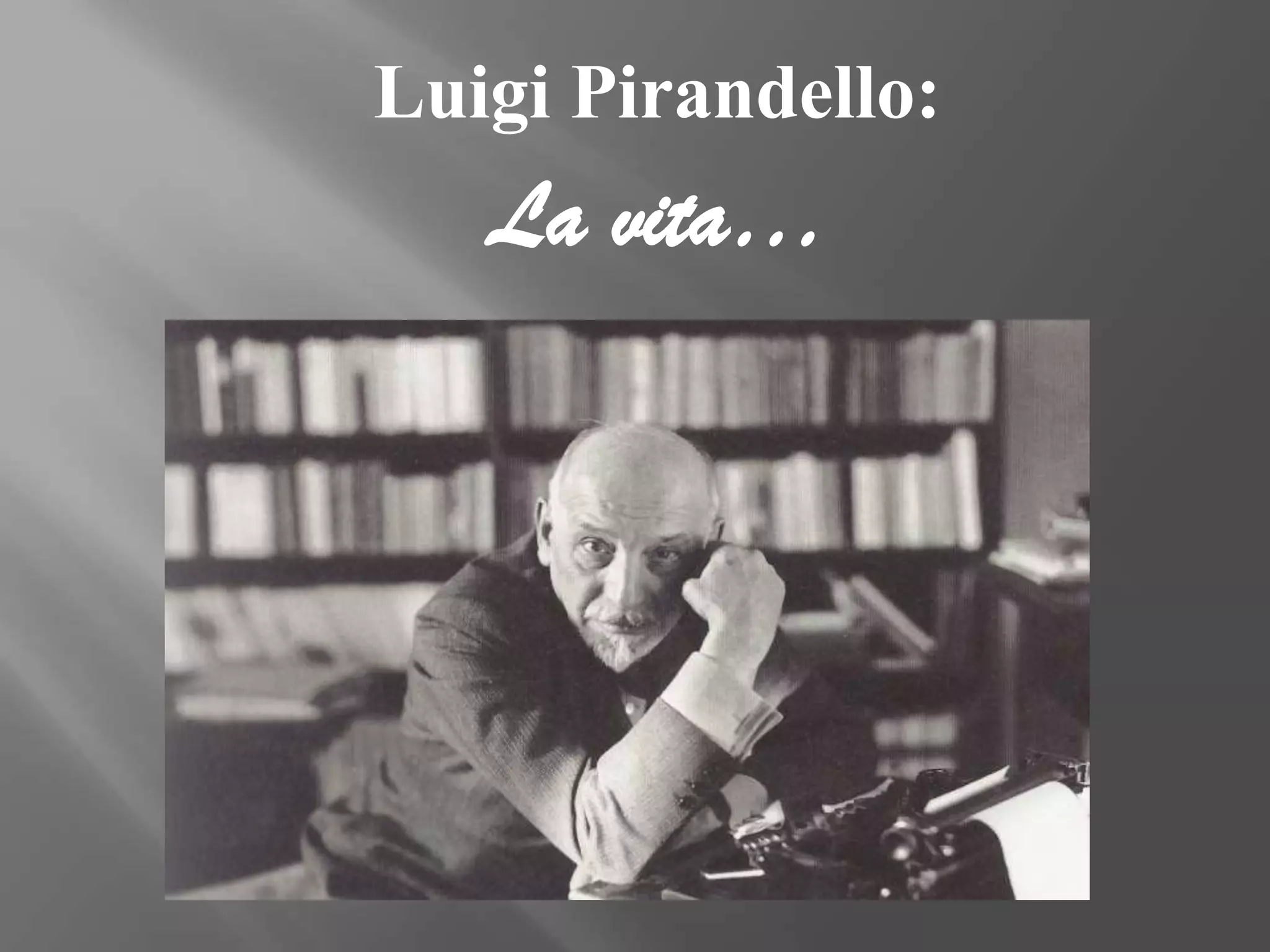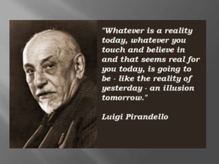 Luigi Pirandello was an Italian writer born in 1867 in Sicily to an upper-class family. He received his education in Palermo and Rome, studying literature. Pirandello wrote hundreds of short stories and novels throughout his life, many dealing with themes of reality and everyday life. Some of his most famous works include the novels The Late Mattia Pascal and One, No one and One Hundred Thousand, as well as the plays Six Characters in Search of an Author and Henry IV. Pirandello won the Nobel Prize in Literature in 1934 for innovating modern theatre through his plays.