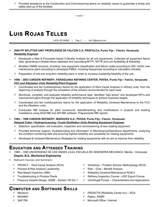 This resume is for Luis Rojas Telles, a Mechanical Engineer with over 22 years of experience in plant reliability engineering for oil and gas companies. He has extensive experience applying reliability techniques like RCM, RBI, and root cause analysis. His most recent role was as a Reliability Centered Maintenance Engineer for NES Global Talent/Qatargas in Qatar, where he developed criticality analyses and maintenance plans. He holds a BS in Mechanical Engineering and is proficient in various reliability software programs.