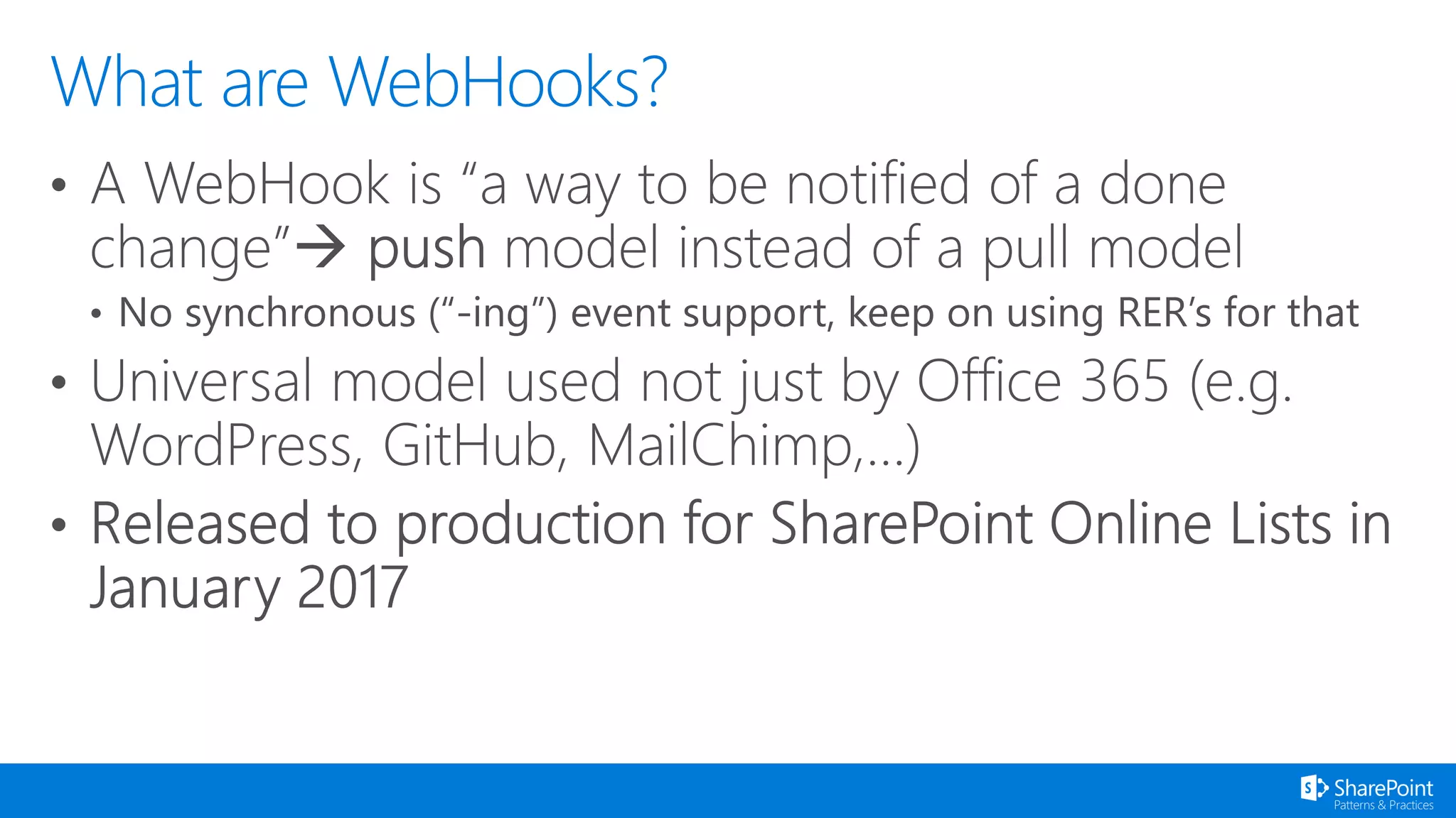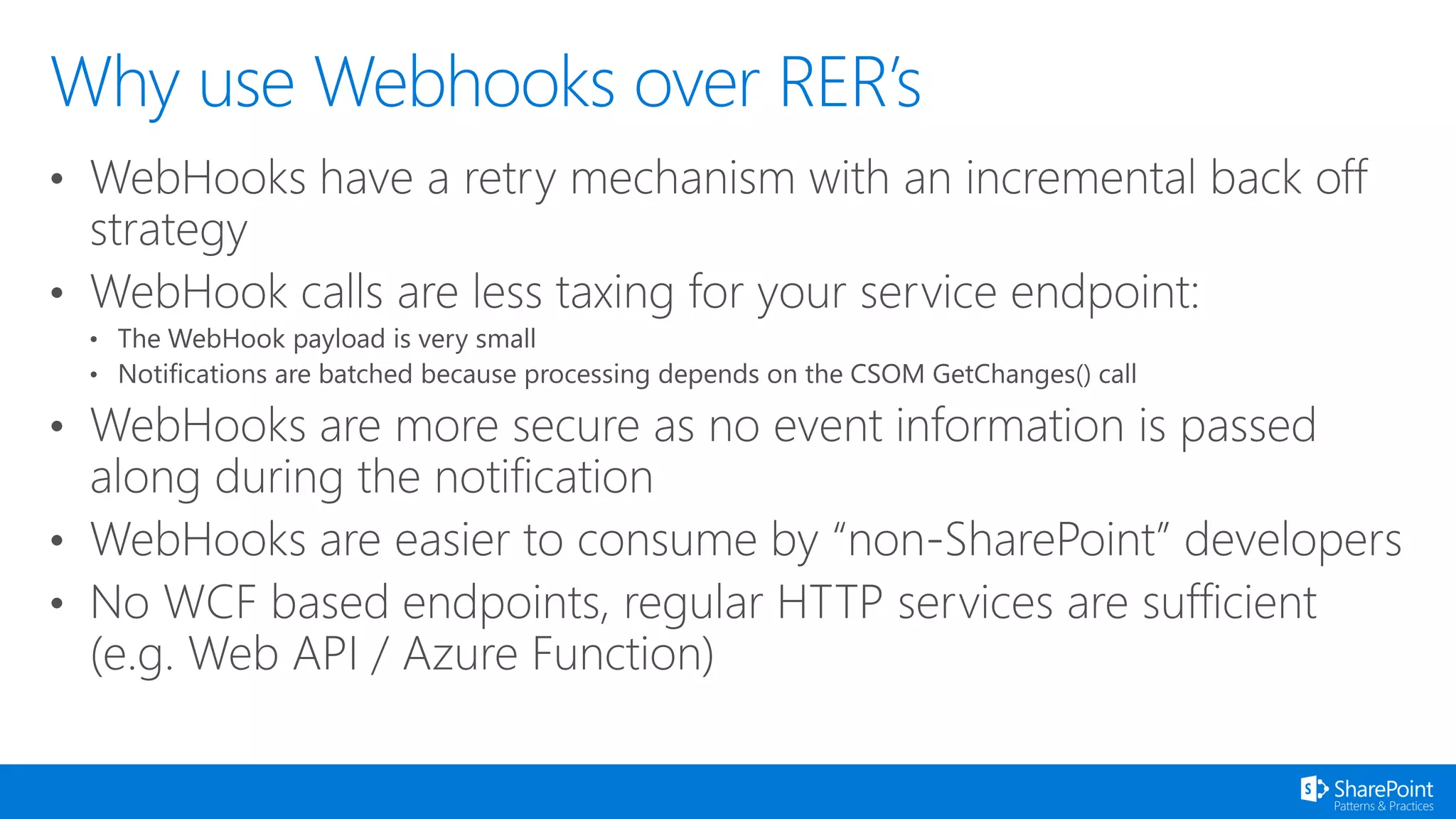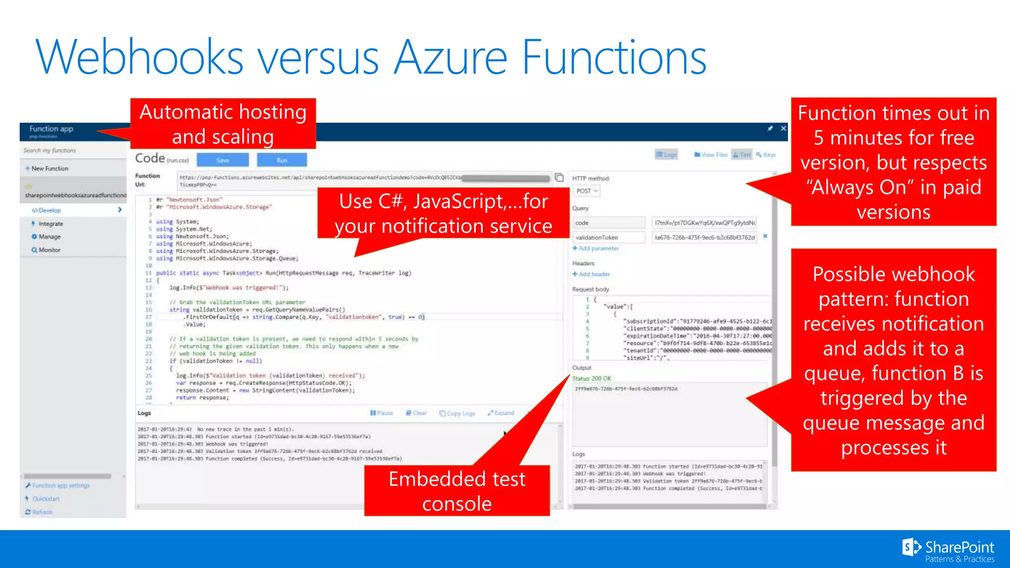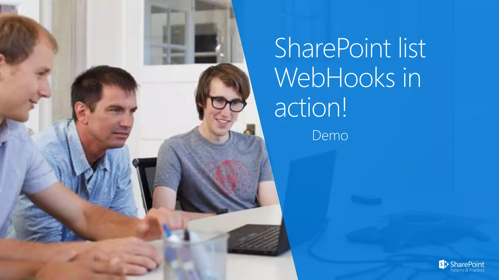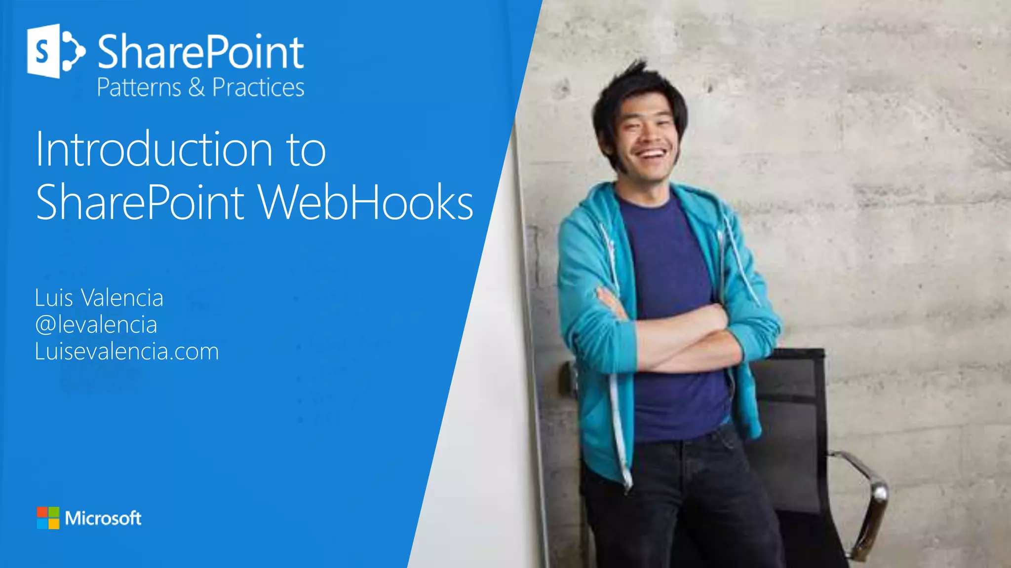 This document provides information about SharePoint webhooks including code samples, documentation, community calls, case studies, and links to Microsoft Graph and Office 365 APIs. It describes how to create a webhook subscription to a SharePoint list using the REST API and receive notifications at a webhook endpoint. It also includes a diagram showing how the webhook notification is received and processed by storing the change token and notifying a webjob.