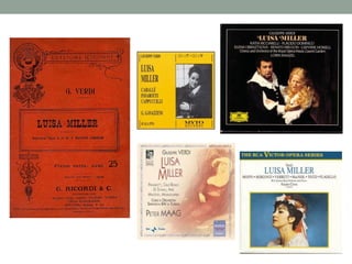 Luisa Miller, un'opera di Giuseppe Verdi del 1849, segna un passaggio importante tra il melodramma borghese e il tragico, ispirata dalla tragedia 'Kabale und Liebe' di Schiller. La trama si concentra sui conflitti tra amori autentici e pressioni sociali, rivelando la psicologia dei personaggi attraverso una struttura drammatica semplificata. Il libretto di Salvatore Cammarano, pur elaborato e intertestuale, è caratterizzato da una rielaborazione ricca che contribuisce all'evoluzione musicale di Verdi, rendendo l'opera un'opera fondamentale nella sua carriera.