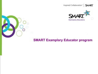 The SMART Exemplary Educator (SEE) program recognizes teachers, technology coordinators, and administrators who effectively use SMART technologies to engage students and improve learning outcomes. The program provides benefits like professional development opportunities, a SEE logo and certificate, access to an online platform with rewards, and the chance to network globally and participate in collaborative projects. Teachers can become a SEE member to receive recognition for their work and take advantage of membership perks.