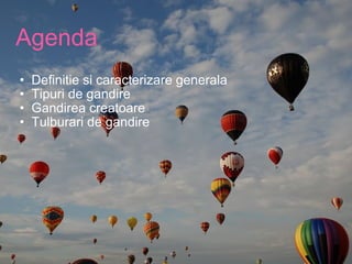 Documentul analizează natura și caracteristicile gândirii, evidențiind importanța acesteia în reflecția și înțelegerea realității. Gândirea creatoare, esențială pentru inovație, se uită la stadii precum pregătirea, incubația, iluminarea și verificarea, subliniind eficiența colaborării în grupuri. De asemenea, discută despre tulburările de gândire, care sunt clasificate în tulburări de proces și tulburări de conținut, asociate adesea cu schizofrenia.
