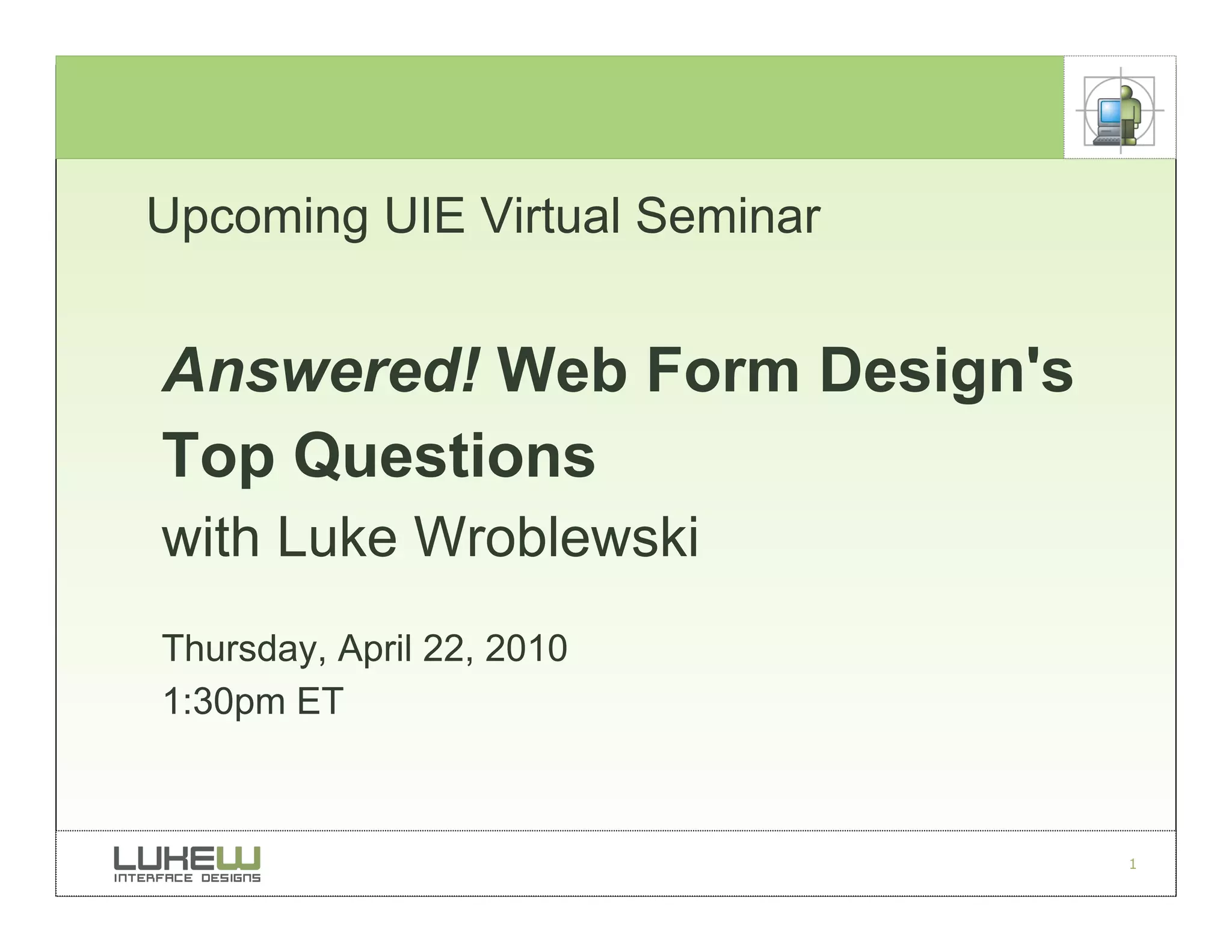 The document announces an upcoming virtual seminar on April 22, 2010 from 1:30-2:30pm ET hosted by Luke Wroblewski to answer top questions about web form design. One example question asks about best practices for placing "Next" and "Back" buttons on forms with multiple pages, with Luke responding that "Next"/ "Continue" buttons should be on the right as the primary actions for completing the form, while "Back"/"Previous" buttons belong on the left as secondary actions.