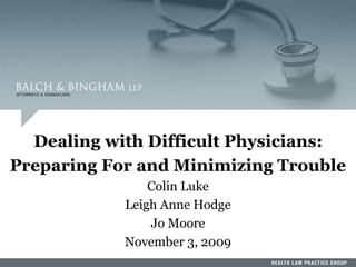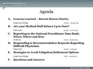 This document summarizes a presentation on dealing with difficult physicians. It includes an agenda that covers lessons learned from recent problematic cases involving physicians, ensuring medical staff bylaws are up to date, reporting to the National Practitioner Data Bank, responding to recommendation requests, and litigation strategies. One session provides details of a case where a physician was arrested twice for sexual crimes involving juvenile patients. The document reviews standards for peer review immunity under the Health Care Quality Improvement Act and state statutes. It also summarizes several court cases related to hospital peer review and credentialing.