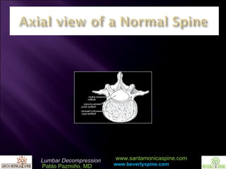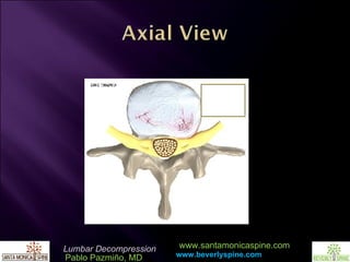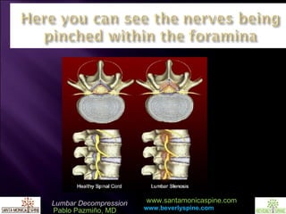 Dr. Pablo Pazmiño discusses the normal spine structure and the effects of arthritis on spinal health, emphasizing the importance of a foundational understanding of MRI imaging in spinal surgery. He outlines the process of minimally invasive lumbar decompression surgery, detailing the techniques used to avoid destabilizing the spine, including hemilaminotomy and careful decompression. The presentation concludes with an invitation for referrals for consultations related to lumbar decompression.