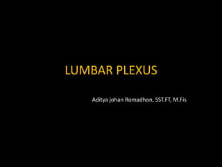 The lumbar plexus is formed from the ventral rami of the L1-L4 spinal nerves and contribution from T12. It provides motor and sensory innervation to the anterior and medial thigh. The branches include the iliohypogastric, ilioinguinal, genitofemoral, femoral, lateral femoral cutaneous, and obturator nerves. The ilioinguinal nerve provides cutaneous sensation to the proximal medial thigh and genitals. The obturator nerve supplies the adductor muscles and medial thigh sensation. The femoral nerve is the largest branch, supplying the anterior thigh and quadriceps muscles.