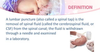 A lumbar puncture, or spinal tap, is a procedure to withdraw cerebrospinal fluid for examination, indicated for conditions such as suspected meningitis, infection, or neurological abnormalities. It has strict contraindications, including active bleeding and certain infections, and requires careful aseptic technique and proper infant positioning to minimize complications. Post-procedure care involves monitoring for pain or distress, ensuring cleanliness of the site, and providing necessary analgesia.