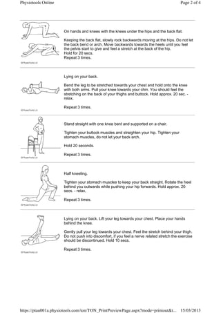 The document describes an exercise program for lumbar stretching rehabilitation. It includes 18 different stretching exercises targeting the lower back and hips. The exercises involve movements such as rolling the knees from side to side, bringing the bent knee towards the chest, tightening stomach muscles to lift the bottom, rocking backwards on hands and knees, and rotating the leg outwards while pulling it towards the chest. Each exercise provides instructions on body position, movement, and number of repetitions.