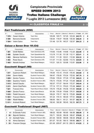 Il documento presenta i risultati finali del Campionato Provinciale Speed Down 2013 a Lumezzane, con le classifiche dei partecipanti suddivisi in diverse categorie. Ogni correttore ha riportato i tempi delle manche e i punteggi totali. Si evidenziano diversi team e concorrenti indipendenti, con dettagli sulle loro performance nelle competizioni.