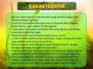 Lumut daun adalah kelompok lumut yang memiliki sekitar 10 ribu spesies, dengan struktur tubuh terdiri dari akar (rizoid), batang, dan daun. Tumbuhan ini dapat bertahan di berbagai habitat, termasuk tanah gundul dan permukaan bebatuan, dan memiliki peranan penting sebagai obat tradisional. Lumut daun berkembang biak secara aseksual dan seksual, serta memiliki beberapa ciri khas morfologi seperti daun yang tersusun spiral dan sporangium yang terdiri dari kapsul dan kaki.