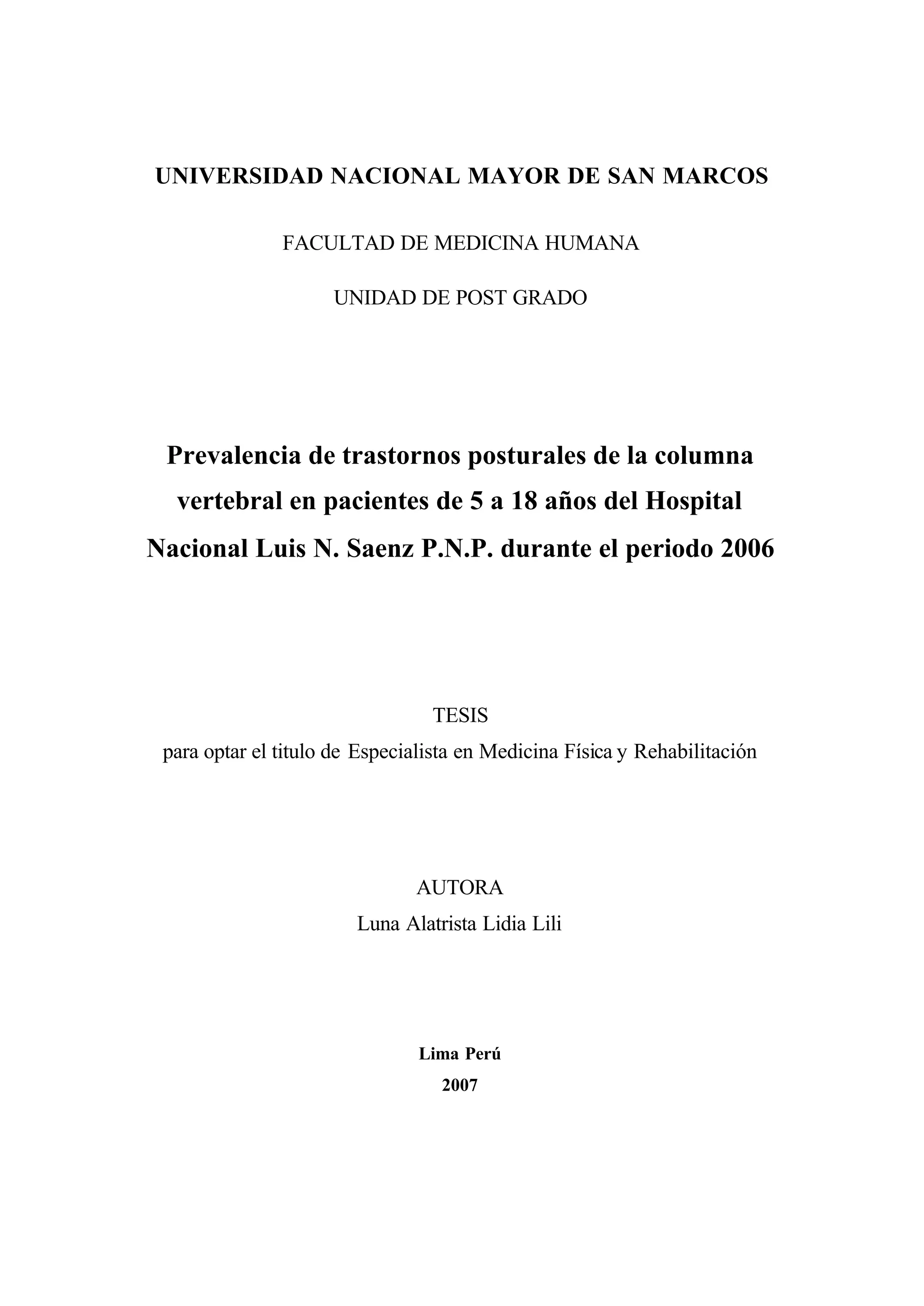 This document summarizes a study on the prevalence of spinal column disorders in patients ages 5 to 18 at a Peruvian hospital from 2006 to 2007. The study found that 33.3% of patients had some type of spinal disorder, with the most common being lordosis (17.8%) and scoliosis (15.5%). Girls had a higher rate of scoliosis (20.6%) than boys (10.5%). Most disorders were mild, though some severe cases required bracing or surgery. In conclusion, spinal disorders were highly prevalent in young patients.