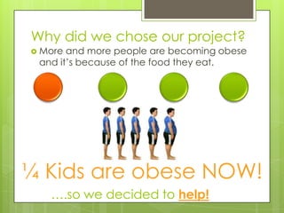 The document summarizes a student project investigating the healthiness of school lunch orders. The students conducted research on healthy and unhealthy foods, created a traffic light system to categorize lunch items, surveyed neighborhood residents about their lunch habits, and found that on average the school received 70 lunch orders per week. Their findings suggested that processed foods, sugary items, and fried foods were making students unhealthy, while fruits, vegetables, whole grains and proteins provided better nutrition.