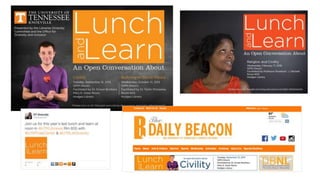 This document summarizes a lunch and learn series hosted by the University of Tennessee, Knoxville libraries on diversity topics from 2014-2016. It describes the planning process which included campus surveys to determine discussion topics, identifying discussion leaders, and event logistics. Several lunch and learn events were held on topics like social media/bullying and civility. Surveys after events provided feedback. In 2016, state funding cuts impacted campus diversity efforts. The library committee continued the series with increased interest in social justice topics. Observations and tips covered facilitating conversations, topic selection, addressing backlash, and gauging campus climate.