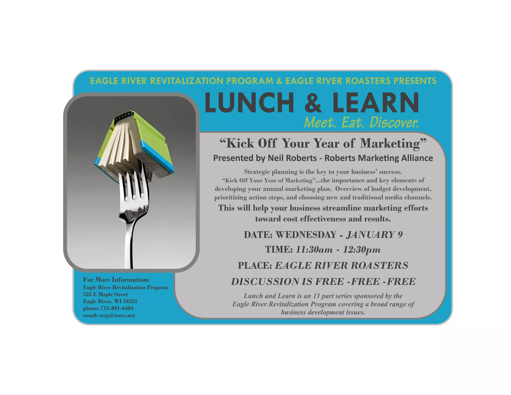 The Eagle River Revitalization Program is hosting a Lunch & Learn event titled 'Kick Off Your Year of Marketing' presented by Neil Roberts from the Roberts Marketing Alliance. This session will focus on the key elements of developing an annual marketing plan, including budget development, prioritizing actions, and media channel selection. The event is free and scheduled for January 9 from 11:30 AM to 12:30 PM at Eagle River Roasters.