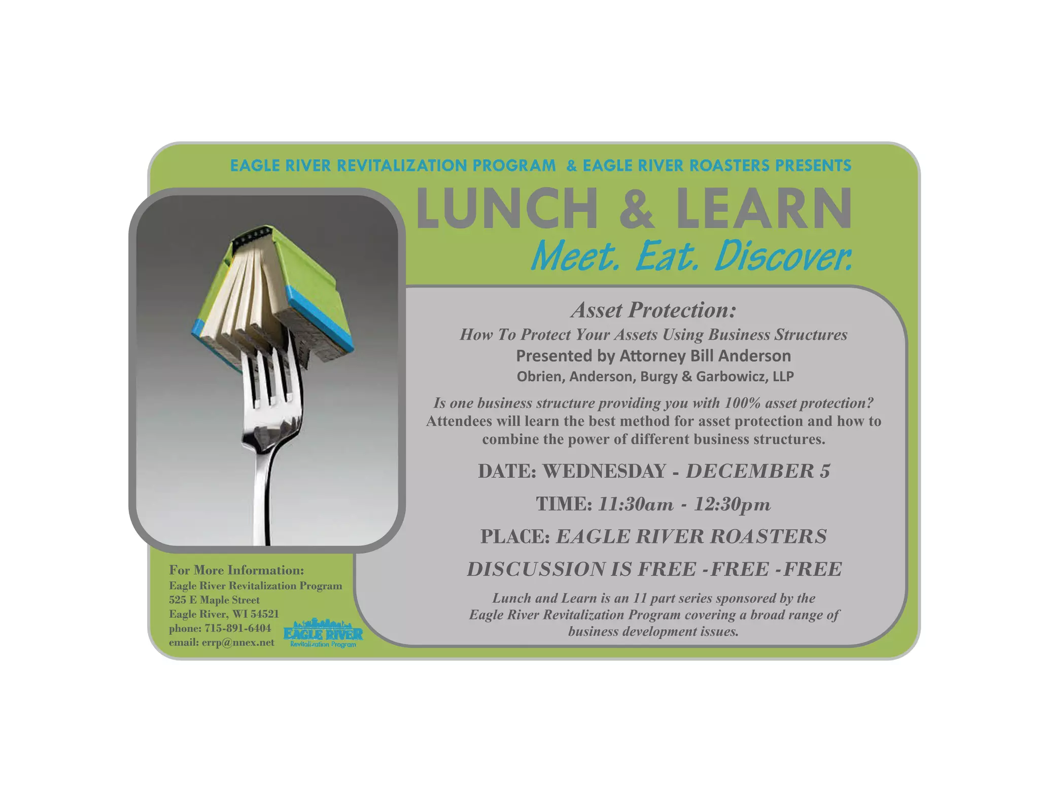This event announcement is for a "Lunch and Learn" session hosted by the Eagle River Revitalization Program and Eagle River Roasters on December 5th from 11:30am to 12:30pm. Attorney Bill Anderson will present on how businesses can protect their assets using different business structures and the best methods for achieving 100% asset protection by combining structures. The discussion is free and open to attendees with lunch provided.