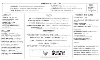 This document appears to be a menu for an Italian restaurant. It lists appetizers, salads, pasta dishes, meat and fish main courses. It also includes a selection of wines, cocktails and non-alcoholic drinks. The menu offers both classic Italian antipasti and primi dishes as well as options featuring locally sourced ingredients from area farms.