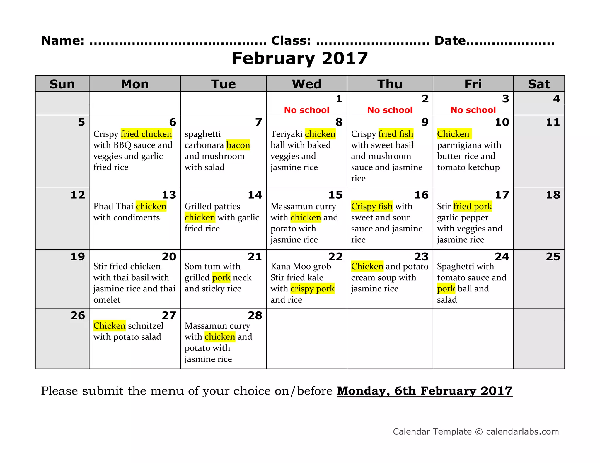 This document is a calendar template for February 2017 that includes the weekly menu for a class. The menu consists primarily of dishes from Southeast Asian cuisine such as Thai, including pad Thai, som tum, massamun curry, and stir fries with chicken, pork, fish and vegetables served with jasmine rice. The calendar also notes two days with no school and a deadline of February 6th to submit the menu choice.