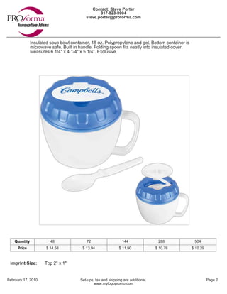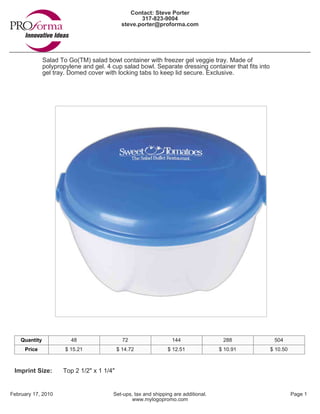 This document provides pricing and product details for various food containers and bags that can be customized with logos. It includes details on Salad To Go salad bowls, insulated soup bowls, divided Lunch To Go containers, Swirl lunch totes, and Duplex lunch bags. Pricing is given in quantities of 48, 72, 144, 288, and 504 units. The contact is Steve Porter at 317-823-9004 or steve.porter@proforma.com.