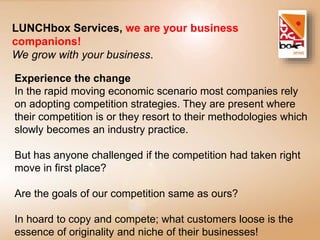 LUNCHbox Services provides business consulting and growth strategies. They help clients invest only in areas that will maximize benefits and focus on creating satisfied customers. Their approach is to encourage clients to think differently and challenge whether their competition has taken the right approach. LUNCHbox Services specializes in helping clients launch new services, upgrade their brand, build business networks, manage customer relationships, and develop human resources. They present several case studies of clients who achieved success through strategies developed by LUNCHbox Services.