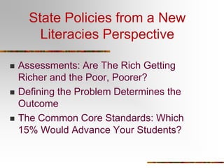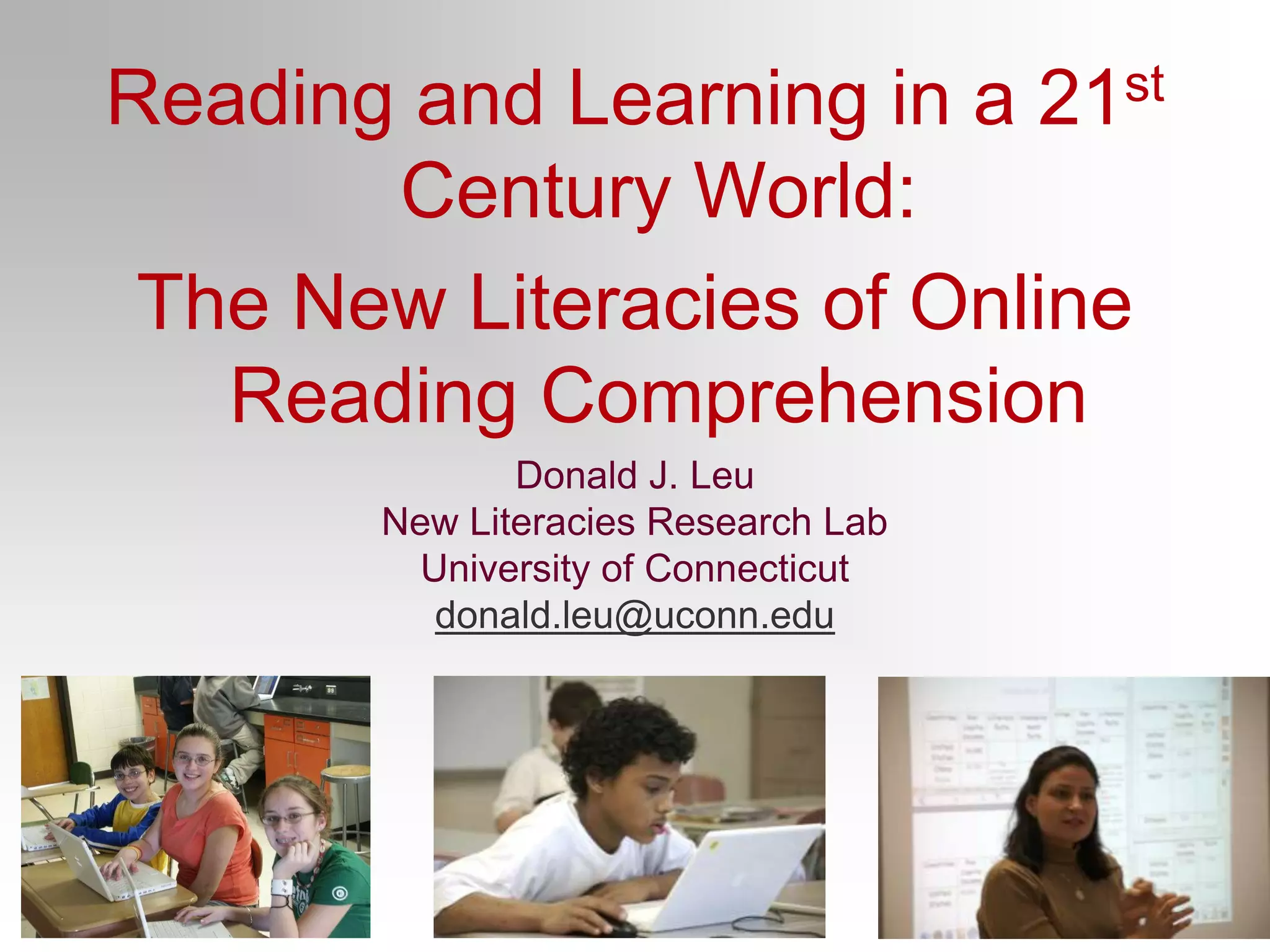 This document summarizes research on the new literacies required for online reading comprehension in the 21st century. It finds that the internet is now the defining technology for reading, requiring additional skills like evaluating online information and problem-solving. Research shows online and offline reading skills are distinct. The document calls for changes to standards, assessments, instruction and professional development to support students in developing these new literacies to succeed in a global digital economy. It provides examples of research and policies from other countries that have recognized this need for change to prepare students for their reading and learning futures.