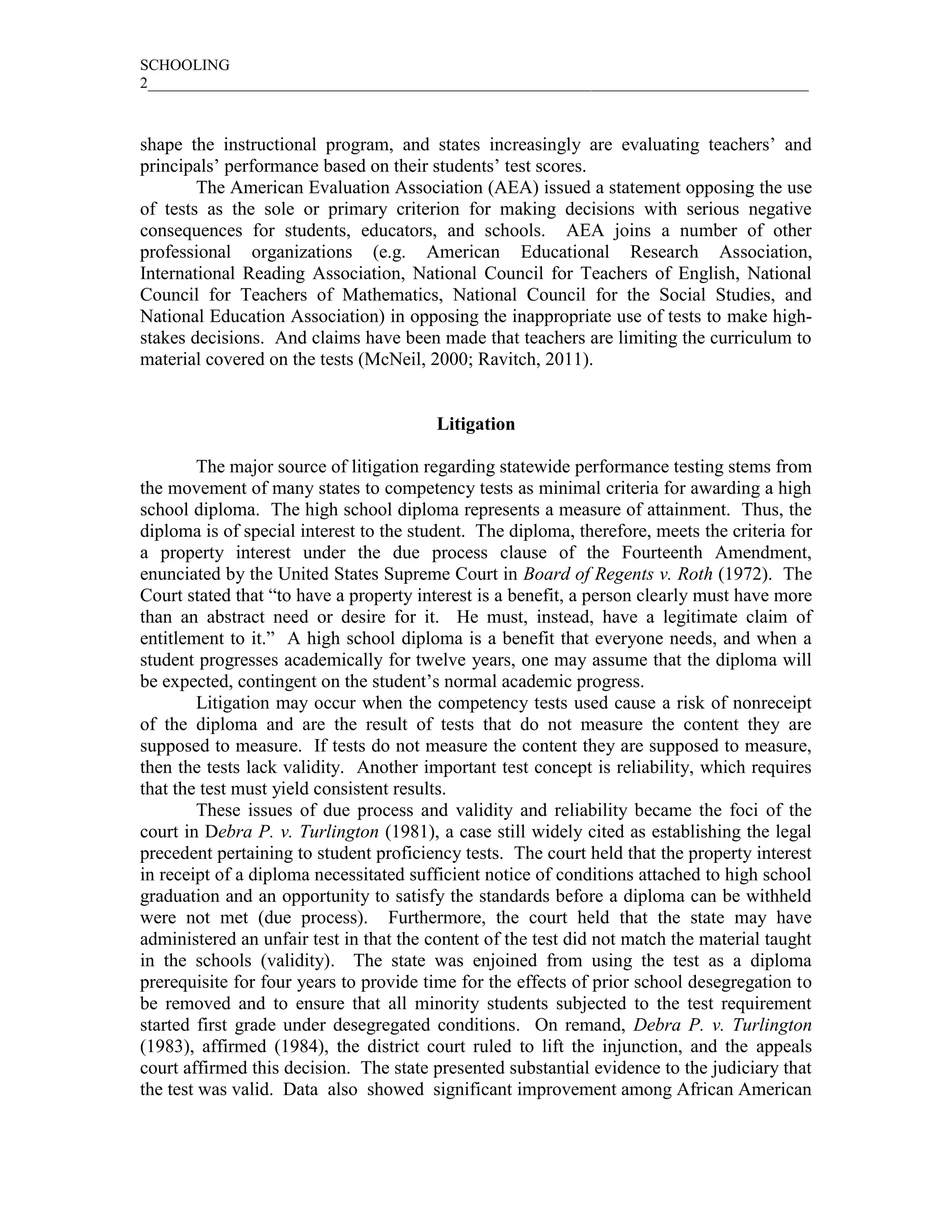 Statewide performance testing is mandated by federal law and state legislation. This has led to litigation regarding the implementation and use of these high-stakes tests. Courts have generally upheld state testing programs if the tests are aligned with curriculum, students are notified of testing requirements, and tests do not perpetuate discrimination. However, courts have ruled against withholding diplomas or preventing graduation participation based solely on test scores without other opportunities. Accommodations for students with disabilities are also an ongoing issue in statewide testing programs.