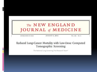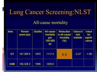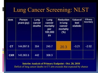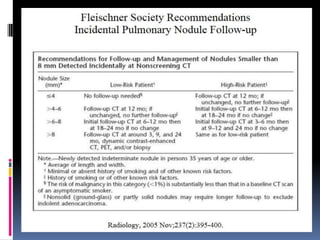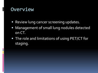 The document reviews current topics in lung cancer imaging, including updates on lung cancer screening, management of small lung nodules, and the limitations of PET/CT for staging. It emphasizes the importance of low-dose CT screening for high-risk patients, the statistics from the NLST study, and the necessity for insurance coverage for screenings. Additionally, it discusses the challenges of overdiagnosis and radiation exposure while outlining the Fleischner guidelines for follow-up care of lung nodules.
