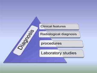 The document discusses lung abscess, including its definition, classification, microbiology, risk factors, pathophysiology, clinical features, diagnosis and treatment. A lung abscess is a microbial infection that causes necrosis of lung tissue, forming a cavity. It is usually caused by aspiration of oral anaerobic bacteria. Symptoms include cough, sputum production and fever. Diagnosis involves imaging showing a cavity with an air-fluid level. Treatment involves long-term antibiotics targeting the causative bacteria. Surgery is rarely needed except for failure of medical management or an underlying condition.