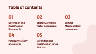 This document discusses lung abscess, including definitions, classifications, causes, risk factors, clinical manifestations, investigations, and management. It begins with defining pneumonia and classifying it based on anatomy and pathogen. Common causes of pneumonia by age group and risk factors are discussed. Clinical manifestations of pneumonia include fever, cough, chest pain, and dyspnea. The document then defines a lung abscess and classifies it as acute or chronic based on duration and etiology. Causes include aspiration, bronchial obstruction, and spread from other sites of infection. Risk factors for gram-negative colonization are listed. Symptoms of a lung abscess include cough, foul sputum, hemoptysis, and chest pain. Invest