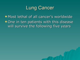 Lung cancer is the most lethal cancer worldwide, with only 10% of patients surviving more than five years. Smoking is the primary risk factor for lung cancer, along with asbestos exposure and coal dust. Symptoms include a chronic cough, weight loss, and fatigue. While only 10% of patients can be cured, preventing lung cancer includes quitting smoking, eating healthy, avoiding secondhand smoke, and being aware of workplace exposures.