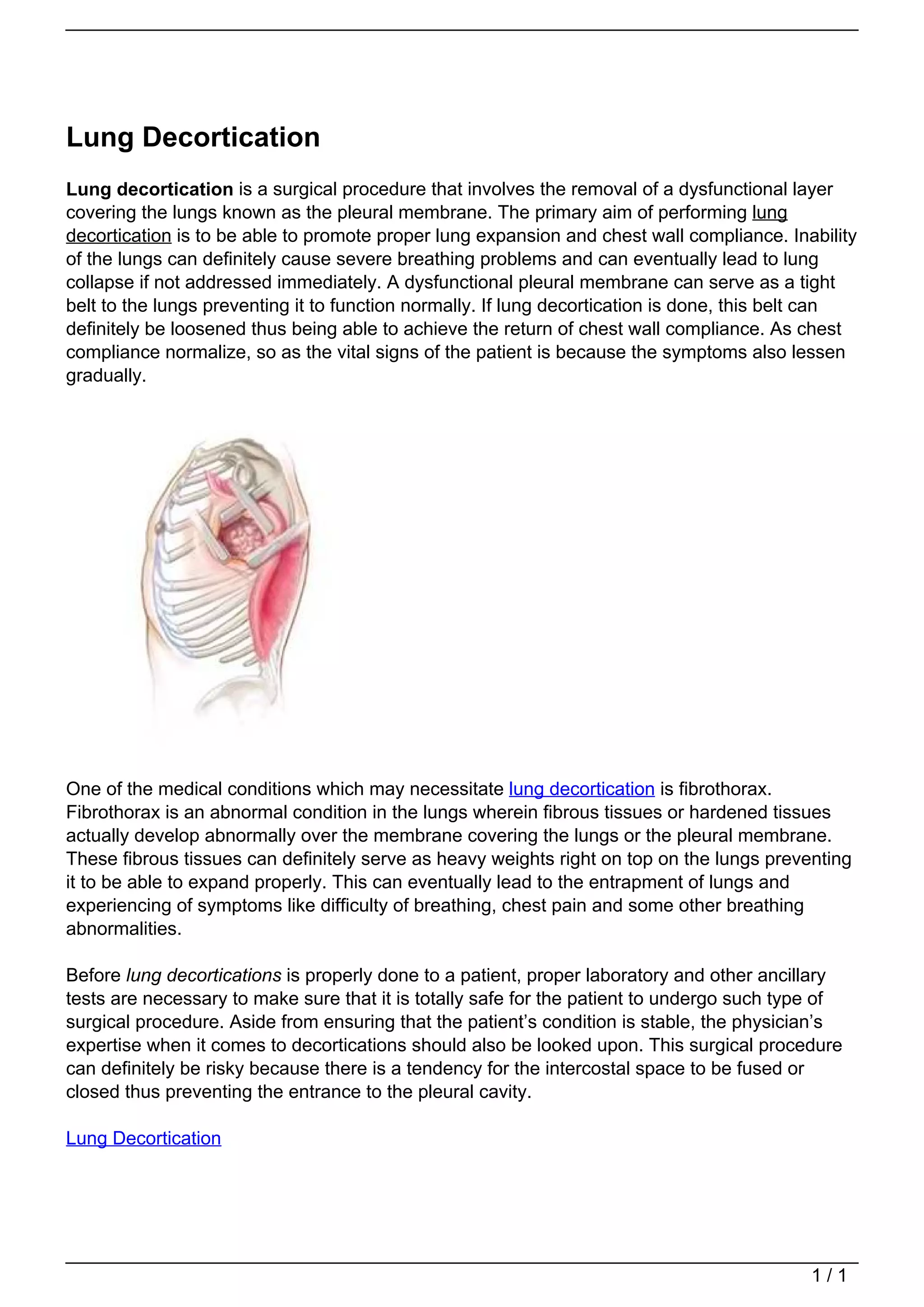 Lung decortication is a surgery to remove the pleural membrane covering the lungs to promote proper lung expansion and breathing. A dysfunctional pleural membrane can restrict lung movement and cause breathing problems or collapse. One condition requiring lung decortication is fibrothorax, where abnormal thickened tissue develops over the pleural membrane, weighing down the lungs. Doctors perform tests to ensure safety before lung decortication due to risks like fusion of the intercostal space.