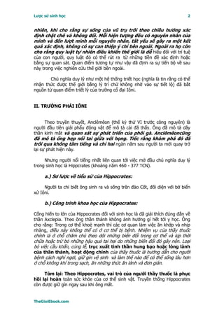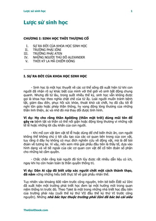 Tài liệu trình bày sự phát triển của sinh học từ những thời kỳ cổ đại, nhấn mạnh vai trò của các trường phái triết học như Ioni và Aten trong việc xây dựng nền tảng cho nền khoa học này. Đặc biệt, các nhân vật nổi bật như Hippocrates và Aristotle đã có những đóng góp quan trọng trong việc hiểu biết về cơ thể sống và phân loại sinh vật. Thông qua nghiên cứu và quan sát, họ đã thúc đẩy sự tiến bộ trong y học và sinh học, từ đó mở đường cho những phát triển sau này trong các lĩnh vực này.