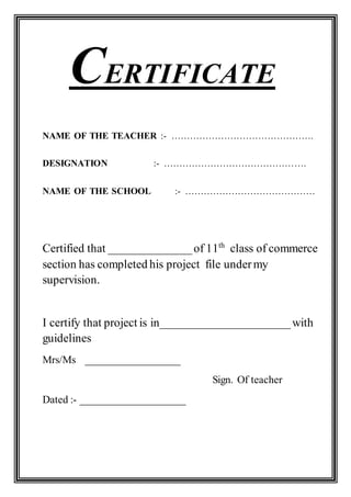 This document is a certificate for a student project. It includes the student's name, class, roll number, subject, and teacher's signature. It certifies that the named student completed a project file under the supervision of the named teacher. The teacher certifies that the project followed guidelines in the specified subject. The student acknowledges the guidance provided by the named teacher during the completion of the project work.
