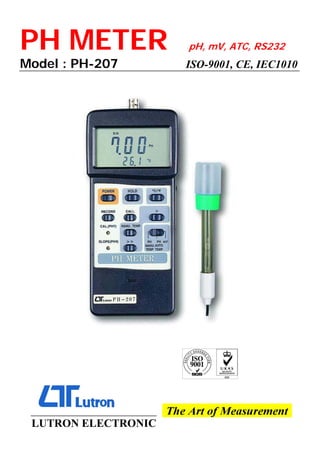 The PH-207 is a versatile pH meter designed for high accuracy in measuring pH, mV, and temperature, featuring automatic and manual temperature compensation, a large dual display, and a user-friendly interface. It includes a compact design, data hold function, automatic shut-off for battery conservation, and options for additional temperature probes and electrodes. The device is suitable for various applications, including water conditioning, aquariums, and laboratory use.