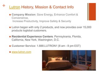 The document provides information on Lutron lighting control systems and products. It discusses how Lutron began with two products and now offers over 15,000 globally. Their HomeWorks QS system integrates light, shade, HVAC and audio/video control for high-end homes. Keypads allow preset lighting scenes with a single button press for convenience. Systems can automatically save energy through daylight and occupancy sensors. Dimming saves significant amounts of money and energy while extending bulb life. Lutron offers a wide range of products from basic dimmers to full home control systems.