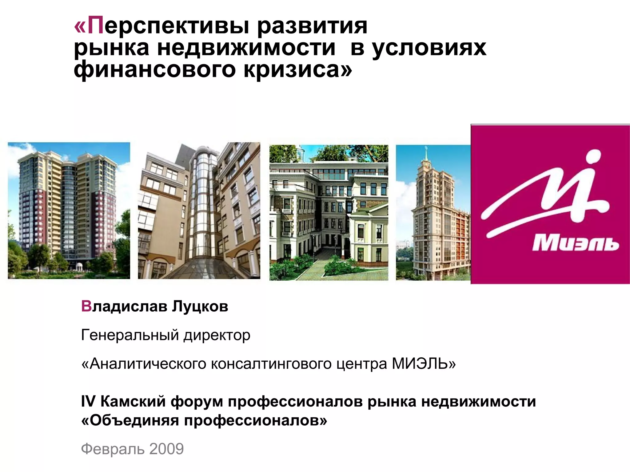 Документ анализирует перспективы рынка недвижимости в России в условиях финансового кризиса 2008 года, отмечая снижение спроса и цен на жилье в Москве и регионах. Прогнозируется стагнация в отрасли, с возможностью банкротства 30-40% компаний. Также рассматриваются изменения в ипотечном кредитовании и потенциальные риски второй волны кризиса.