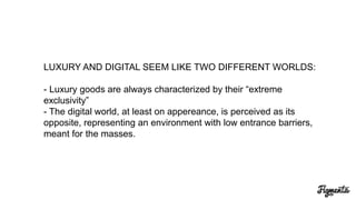 The document discusses digital communication strategies and e-commerce practices for luxury goods, highlighting the challenges of maintaining exclusivity in the digital age. It presents case studies of luxury brands that successfully integrate storytelling, customization, and community engagement to enhance the customer experience and appeal to younger consumers. Furthermore, it emphasizes the creation of a multichannel digital ecosystem, showcasing Burberry as a prime example of innovative integration across platforms.