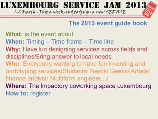 The 2013 Luxembourg Service Jam event guide provides information about a two-day event where participants will work in teams to design new service concepts. The event will take place from March 1-2, 2013 at the Impactory coworking space in Luxembourg. The goal is to have fun inventing and prototyping services to address issues within themes like entrepreneurship, smart cities, and sustainable development. Participants from a wide range of backgrounds are encouraged to attend, work together, and present their service concepts at the end of the event.