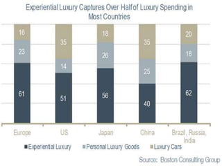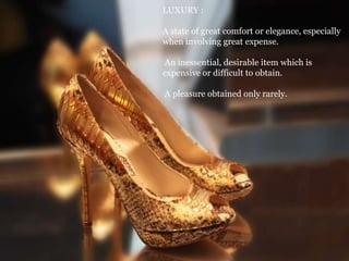 Luxury refers to a state of great comfort or elegance involving great expense. It describes inessential but desirable items that are expensive or difficult to obtain. Luxuries are pleasures obtained rarely. Luxury goods are economic goods or services with demand that increases disproportionately with income. Examples of luxuries include expensive vehicles, trains, yachts, real estate, resorts, and magazines focused on fine crafts and luxury goods. Household luxuries include art, electronics, furniture, and kitchen items. Personal luxuries are clothes, cosmetics, accessories, jewelry, watches, and automobiles. Experiential luxuries include luxury dining, travel, spa services, and physician services. There are five key types of