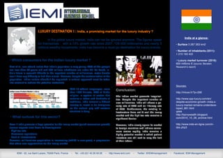 The document discusses the luxury markets in several countries. It provides an overview of India's luxury market, noting its young population and growing middle class as opportunities. For Russia, it notes the country still accounts for 7% of the global luxury market and can rely on its billionaires. The Brazilian luxury market is promising due to increasing wealth and a growing middle class, though it remains underdeveloped compared to Europe and the US. China is positioned to become the largest luxury market by 2020 with over 10 billion spent in the first quarter of 2011 alone and forecasts of 27 billion by 2015. South Korea also shows very strong growth in its luxury sector, with nearly 120,000 millionaires and a culture that values luxury goods.