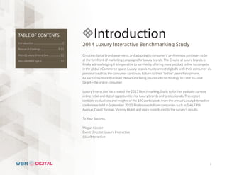 The 2014 Luxury Interactive Benchmarking Study emphasizes the importance of digital engagement for luxury brands to survive in a competitive global ecommerce landscape. Key findings include a significant increase in investments in digital initiatives, with 97% of participants reporting growth in this area, and a strong focus on enhancing mobile strategies and social media engagement. The report highlights the necessity for luxury brands to adapt their marketing strategies to better connect with online consumers and maintain relevance in the evolving digital landscape.