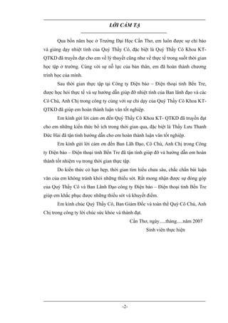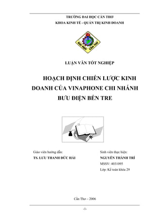Đề tài nghiên cứu 'Hoạch định chiến lược kinh doanh của Vinaphone chi nhánh bưu điện tỉnh Bến Tre' trình bày lý do, mục tiêu, và phương pháp nghiên cứu, cùng với phân tích thực trạng hoạt động kinh doanh của Vinaphone tại tỉnh Bến Tre giai đoạn 2004-2006. Tài liệu cung cấp cái nhìn tổng quát về tình hình cạnh tranh, đề xuất các mục tiêu và chiến lược tối ưu nhằm phát triển doanh thu và thị phần trong bối cảnh cạnh tranh ngành viễn thông. Cuối cùng, các giải pháp cụ thể được đưa ra để thực hiện các chiến lược đã lựa chọn nhằm nâng cao hiệu quả hoạt động của doanh nghiệp.