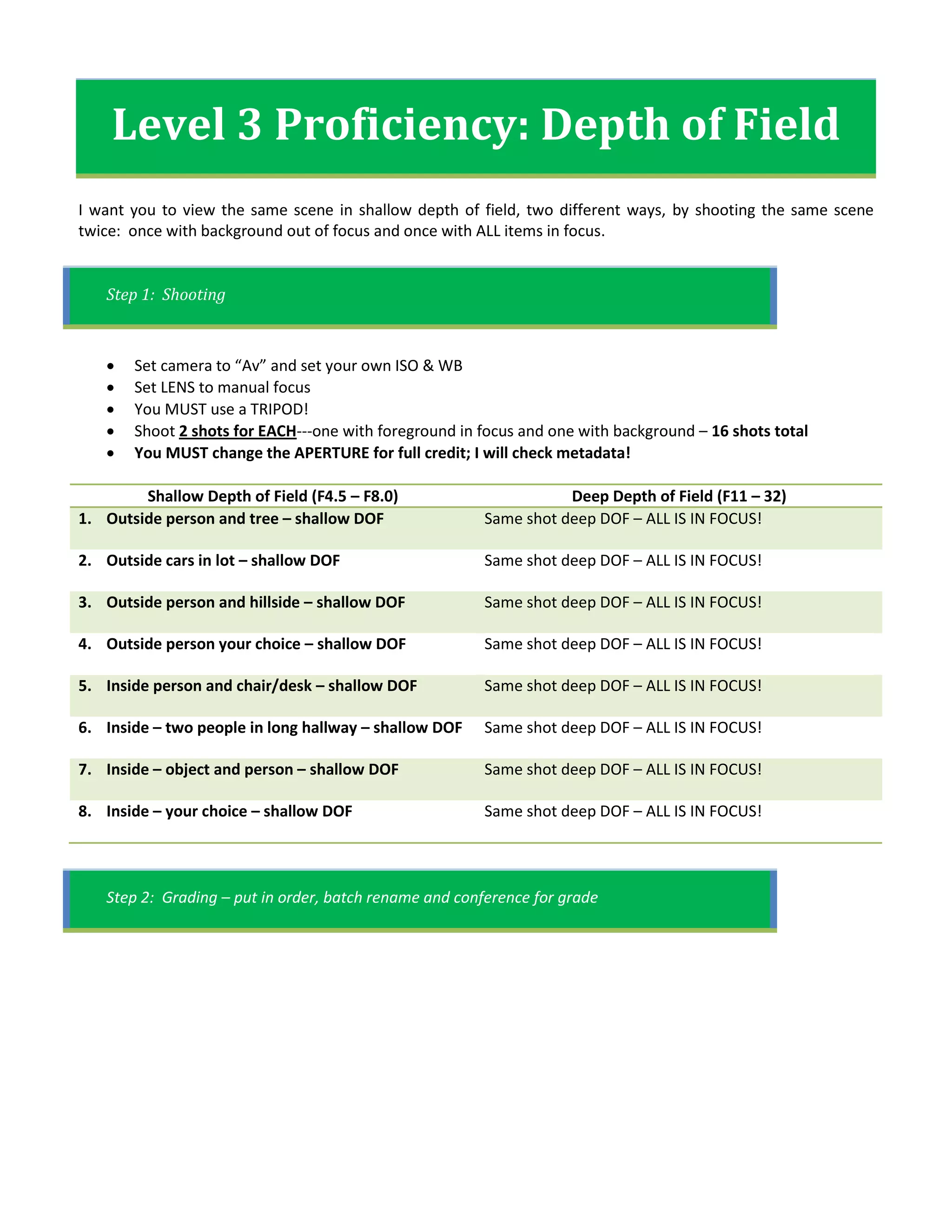 The document instructs the reader to take 16 photographs of various indoor and outdoor scenes twice - once with a shallow depth of field so that the background is out of focus, and again with a deep depth of field so that everything is in focus. It provides examples of shots to take and specifies settings like using a tripod and manually changing the aperture between shots to achieve the different depths of field. The reader is asked to organize and submit the photos for grading.