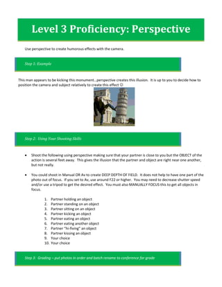 This document provides instructions on using perspective to create humorous photographic illusions. It explains that positioning the camera and subject relative to each other and distant objects can make it appear that the subject is interacting with something nearby when they are actually farther away. Learners are asked to take 10 photos using this technique, with their partner appearing to perform actions like kicking or sitting on objects that are several feet away. They are advised to use a deep depth of field to keep everything in focus.